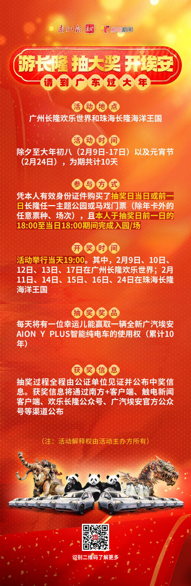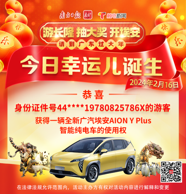 好人啟好運(yùn),最暖是廣東。2月16日,大年初七,由南方+、觸電新聞主辦的“請(qǐng)到廣東過(guò)大年之游長(zhǎng)隆、抽大獎(jiǎng)、開(kāi)埃安”活動(dòng)開(kāi)出第八個(gè)大獎(jiǎng)。隨著“廣東好人”趙曉燕按下開(kāi)獎(jiǎng)鍵,身份證號(hào)為“44****19780825786X”的廣東游客成為今日的幸運(yùn)兒。她將獲得一輛全新廣汽埃安AION Y Plus智能純電車(chē)的使用權(quán)。