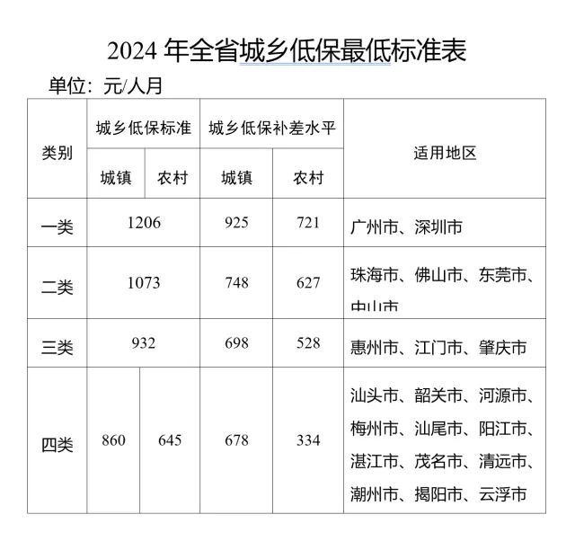 根據(jù)《廣東省社會(huì)救助條例》《廣東省人民政府辦公廳關(guān)于建立全省城鄉(xiāng)低保最低標(biāo)準(zhǔn)制度的通知》和2024年省十件民生實(shí)事任務(wù)要求,日前,經(jīng)省政府同意,省民政廳印發(fā)《2024年全省城鄉(xiāng)低保最低標(biāo)準(zhǔn)》,全省分四類(lèi)地區(qū)制訂城鄉(xiāng)低保最低標(biāo)準(zhǔn),較2023年標(biāo)準(zhǔn)均有所提升。