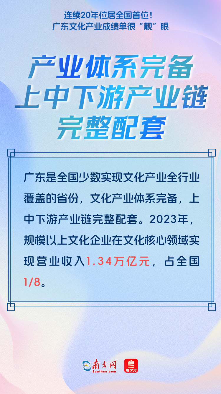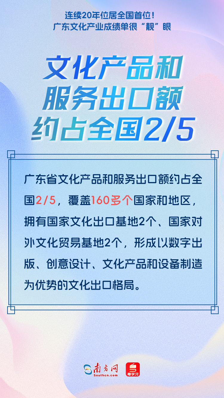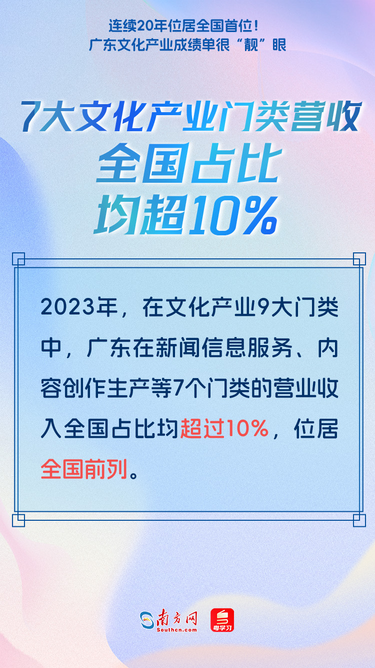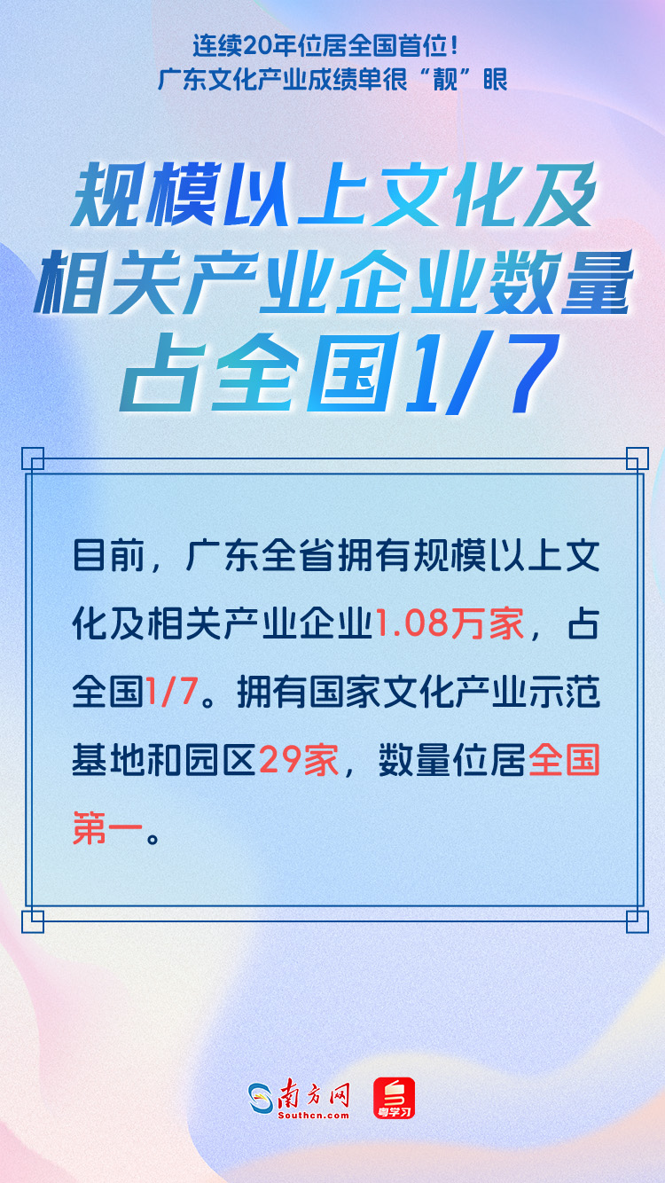 第二十屆中國(guó)(深圳)國(guó)際文化產(chǎn)業(yè)博覽交易會(huì)(以下簡(jiǎn)稱“文博會(huì)”)將于5月23日至27日舉行。近年來,廣東文化產(chǎn)業(yè)取得一系列新進(jìn)展新成效,在本屆文博會(huì)上,廣東展團(tuán)將以“勇立潮頭,推動(dòng)文化產(chǎn)業(yè)高質(zhì)量發(fā)展走在前列”為主題亮相“粵港澳大灣區(qū)文化產(chǎn)業(yè)創(chuàng)新展”,曬出廣東文化產(chǎn)業(yè)“成績(jī)單”。這份成績(jī)單到底有多“靚”?一起來了解↓↓↓