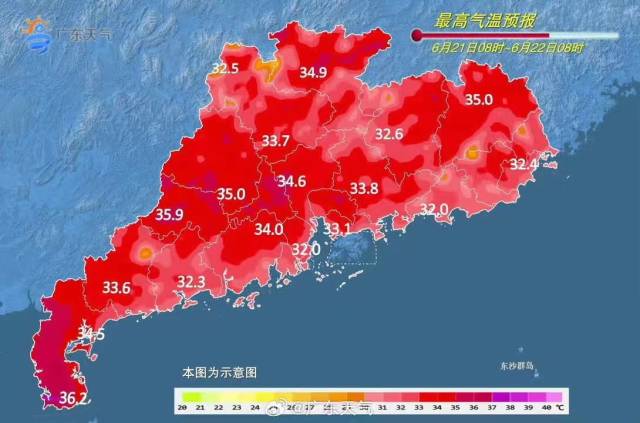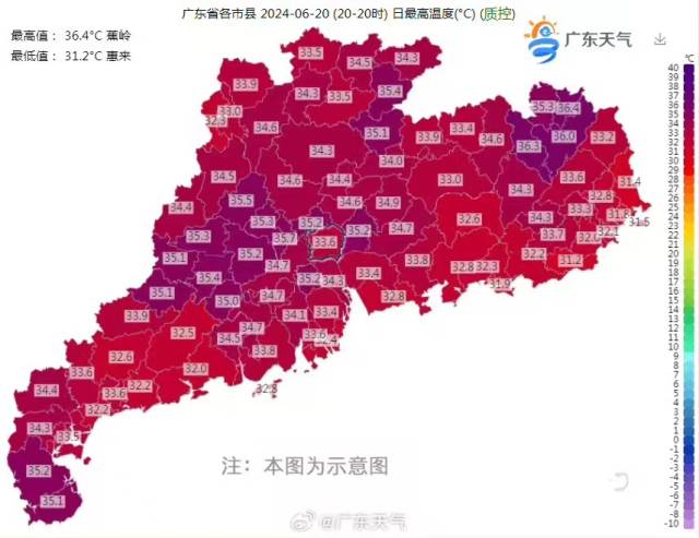 在20日白天,全省大部分市縣的最高氣溫較19日普遍上升了1℃-3℃,其中梅州興寧錄得全省最高氣溫36.3℃。