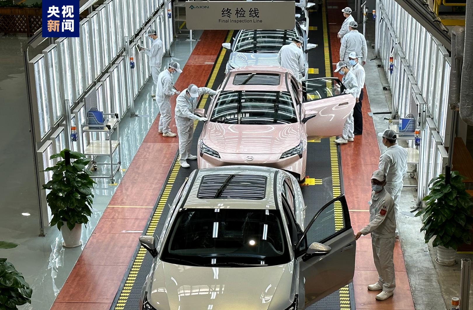 在廣州番禺一個(gè)新能源汽車(chē)智能生態(tài)工廠(chǎng)的總裝車(chē)間,機(jī)械手高速擺動(dòng),不停揮舞。終端處,每?jī)奢v車(chē)的下線(xiàn)時(shí)間間隔只有53秒。