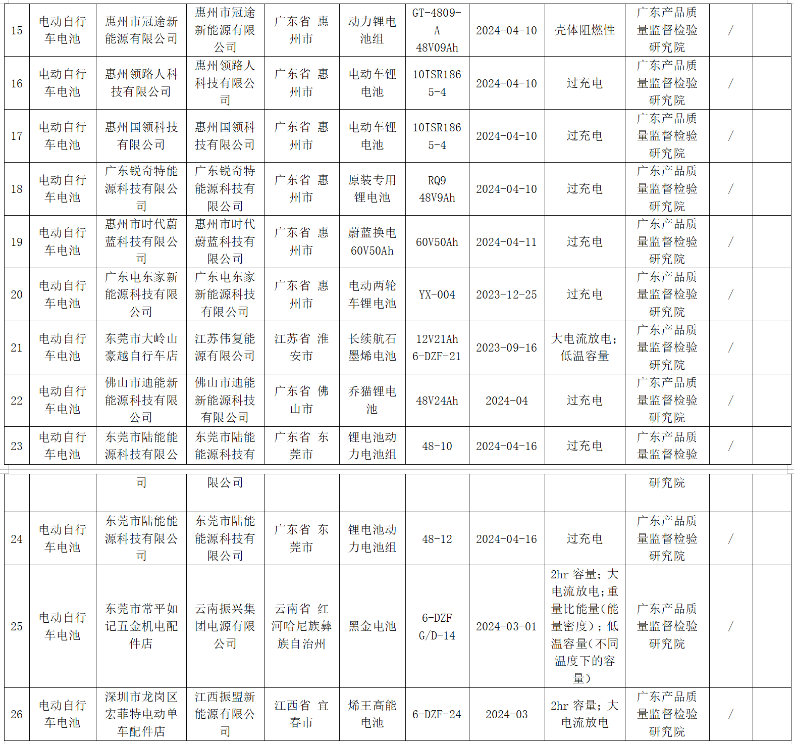 7月24日,廣東省市場監(jiān)督管理局發(fā)布通告稱,經(jīng)該局組織開展的2024年電動自行車電池產(chǎn)品質(zhì)量專項監(jiān)督抽查,共發(fā)現(xiàn)不合格產(chǎn)品26款(詳見附件圖片),其中生產(chǎn)領(lǐng)域不合格產(chǎn)品23款、流通領(lǐng)域不合格產(chǎn)品3款。
