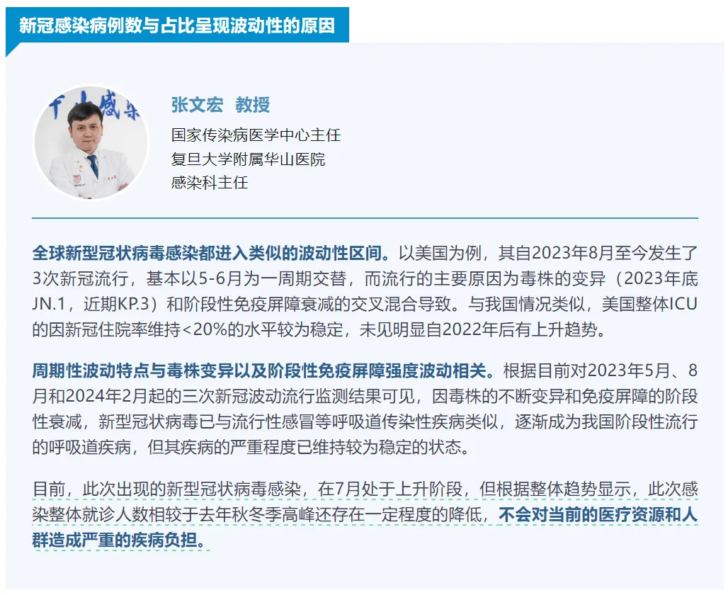 他表示,根據(jù)目前對(duì)2023年5月、8月和2024年2月起的三次新冠波動(dòng)流行監(jiān)測結(jié)果,因毒株的不斷變異和免疫屏障的階段性衰減,新型冠狀病毒已與流行性感冒等呼吸道傳染性疾病類似,逐漸成為我國階段性流行的呼吸道疾病,但其疾病的嚴(yán)重程度已維持較為穩(wěn)定的狀態(tài)。