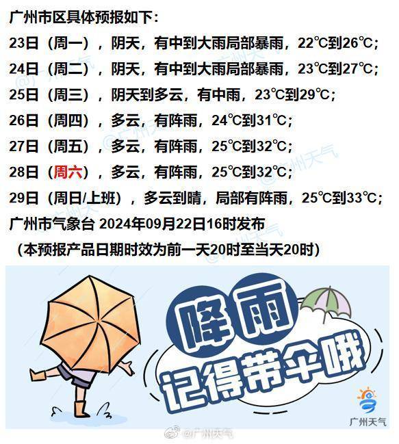 @廣州天氣預(yù)計,未來一周,雨水是主角,“阿冷”來客串。25日起,副熱帶高壓加強(qiáng),廣州降雨減弱氣溫回升,26日起,廣州市區(qū)日最高氣溫有望重新突破30℃。大家出門還是隨身帶傘,及時關(guān)注最新預(yù)報。