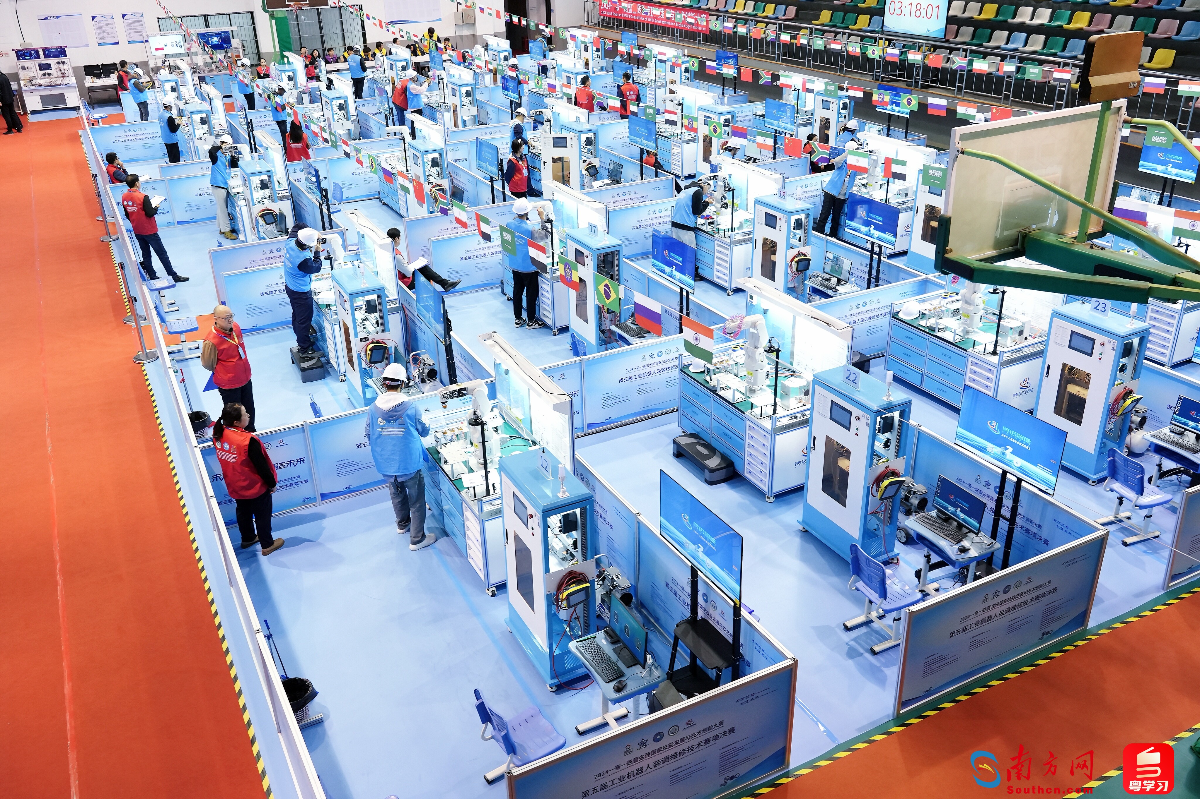 本屆工業(yè)機(jī)器人裝調(diào)維修技術(shù)賽項(xiàng)設(shè)學(xué)生組、職工組、國際組三個組別,吸引了來自塔吉克斯坦、南非等多個國家以及我國浙江、江蘇、天津、山東等省份共49所職業(yè)院校的選手同臺競技。