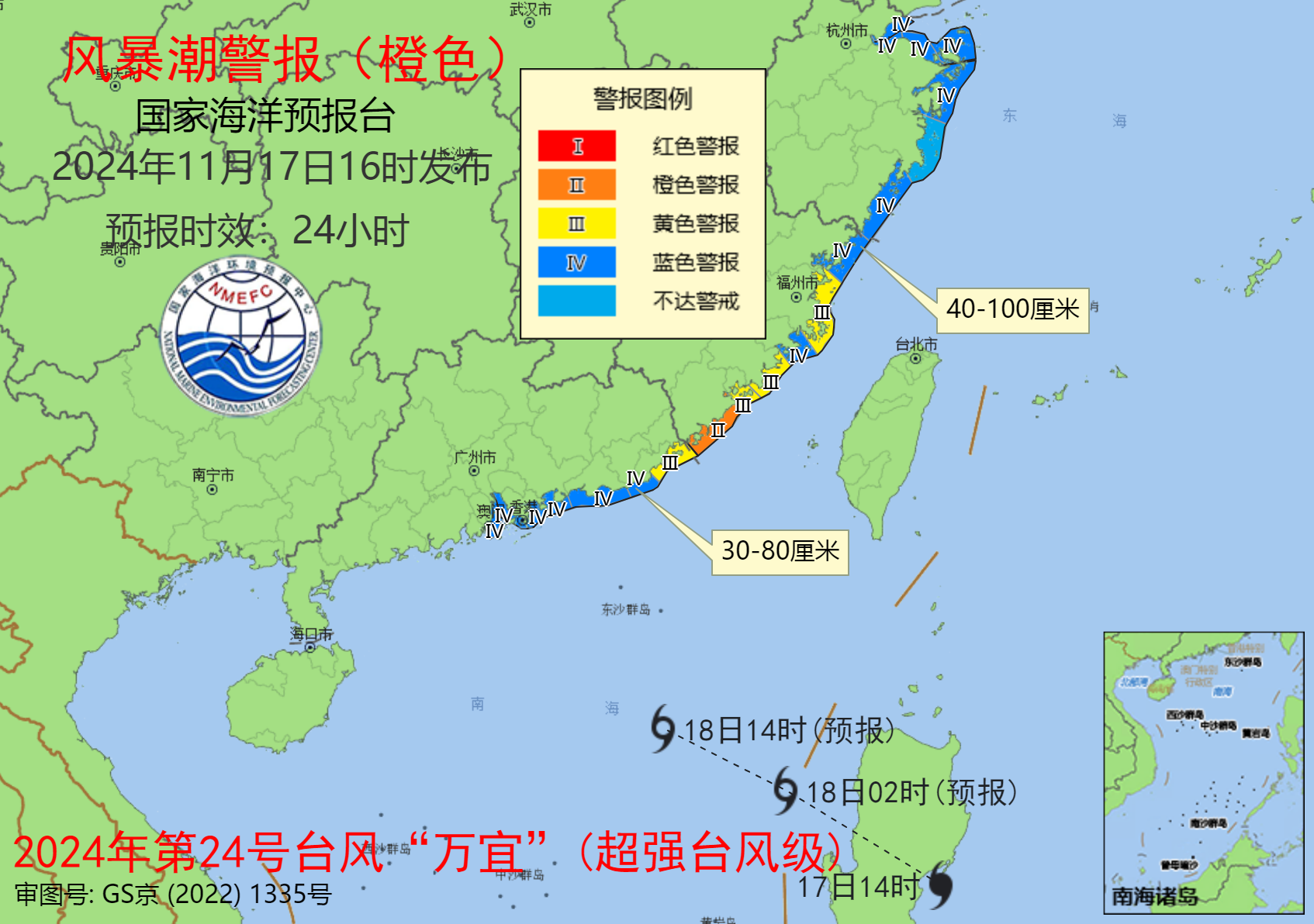 國家海洋預報臺根據(jù)《海洋災害應急預案》,11月17日16時發(fā)布風暴潮橙色警報。受強冷空氣和今年第24號臺風“萬宜”(超強臺風級)的共同影響,預計:17日下午到18日下午,杭州灣至福建漳州沿海將出現(xiàn)40到100厘米的風暴增水,廣東潮州至珠江口沿海將出現(xiàn)30到80厘米風暴增水。福建省漳州市的風暴潮預警級別為橙色,福建省福州市、泉州市、廈門市和廣東省汕頭市的風暴潮預警級別為黃色,浙江省嘉興市、紹興市、寧波市、舟山市、溫州市,福建省寧德市、莆田市,廣東省汕尾市、惠州市、深圳市、廣州市、中山市和珠海市的風暴潮預警級別為藍色。