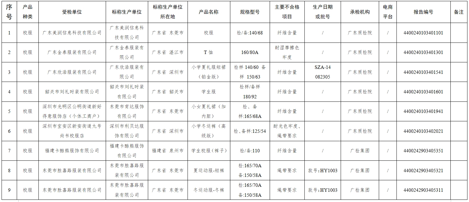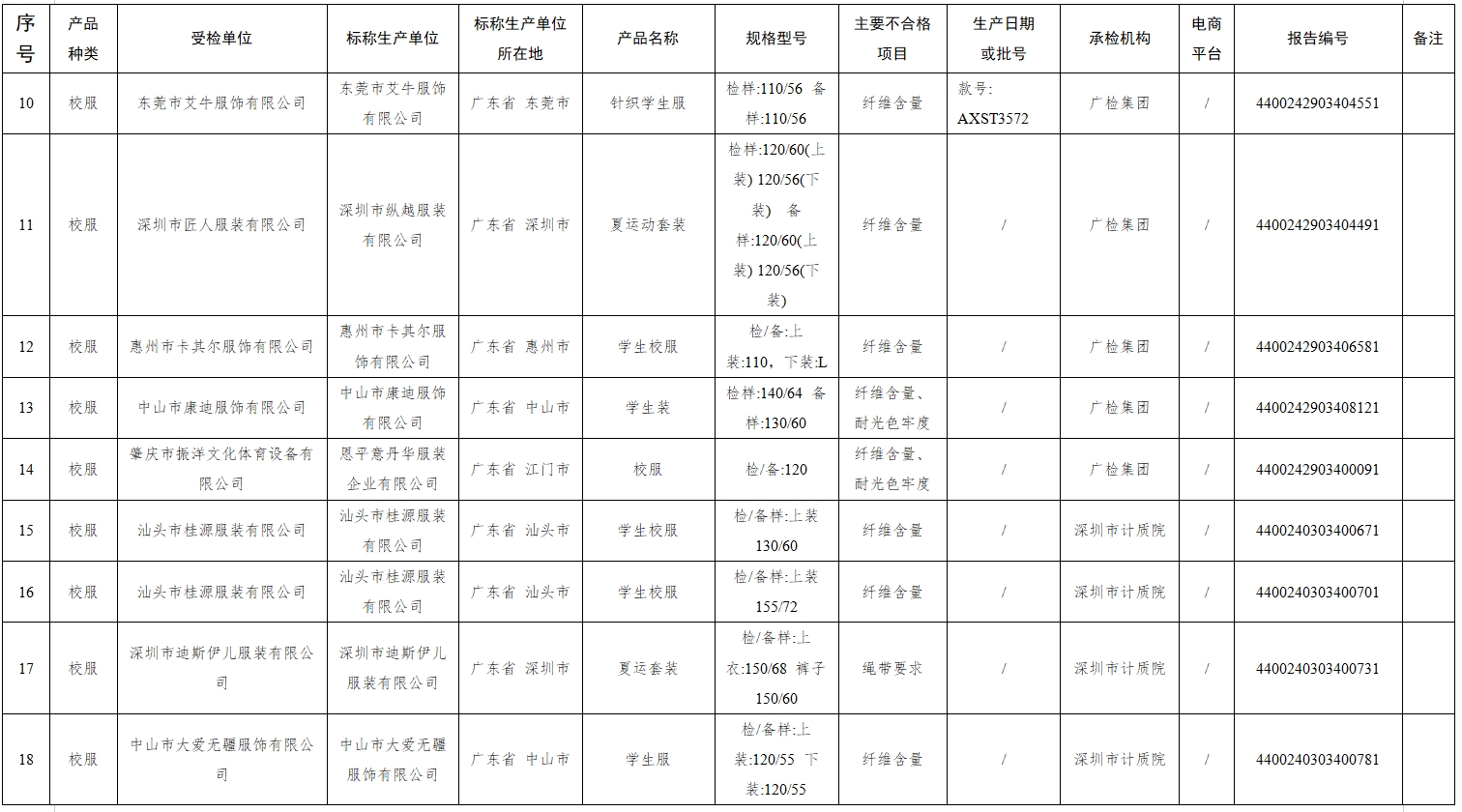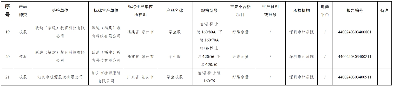日前,廣東省市場(chǎng)監(jiān)督管理局、廣東省教育廳發(fā)布了《關(guān)于2024年校服產(chǎn)品質(zhì)量監(jiān)督抽查情況的通告》,共有21款校服產(chǎn)品抽查不合格。