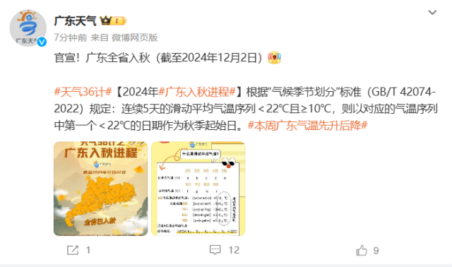 12月2日,@廣東天氣官宣:廣東全省入秋!