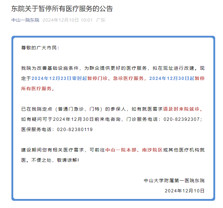 今天(12月10日)中山大學(xué)附屬第一醫(yī)院東院發(fā)布《東院關(guān)于暫停所有醫(yī)療服務(wù)的公告》。據(jù)了解,該院將進(jìn)行改擴(kuò)建,未來規(guī)劃定位為心腦血管疑難救治中心。據(jù)公告,該院于2024年12月23日零時起暫停門診、急診醫(yī)療服務(wù),2024年12月30日起暫停所有醫(yī)療服務(wù)。