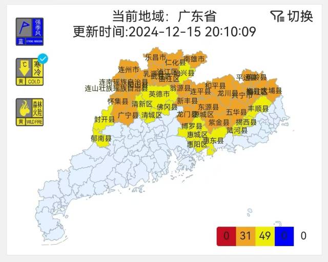 截至15日19時(shí)30分,全省已啟動(dòng)31個(gè)寒冷橙色預(yù)警和49個(gè)寒冷黃色預(yù)警,主要覆蓋粵北、珠三角東北部和粵東北部市縣。另外,我省大部干燥天氣維持,各地的森林火險(xiǎn)預(yù)警信號(hào)均繼續(xù)生效中。
