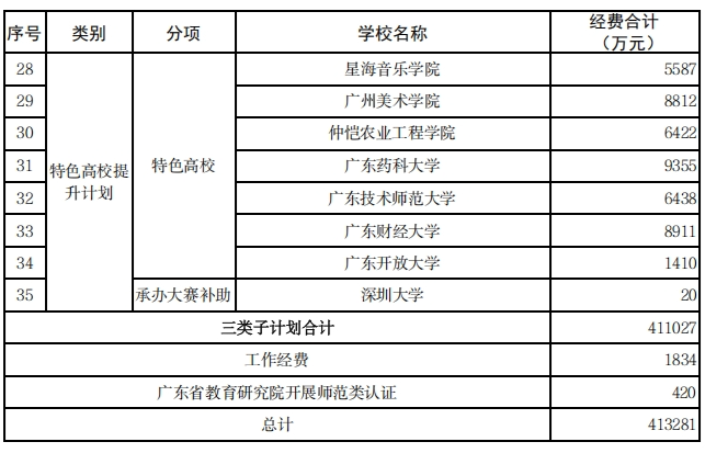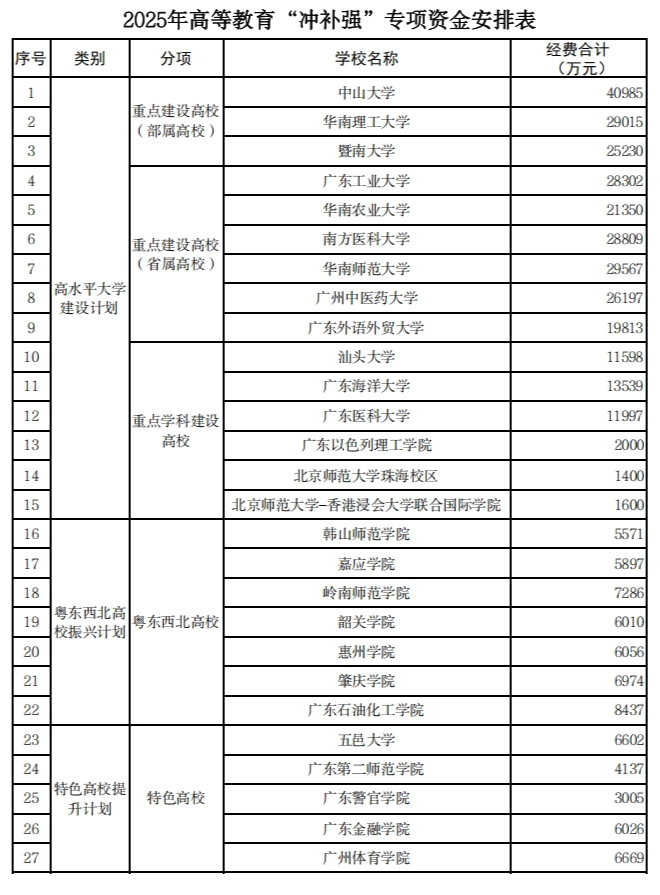 12月18日,廣東省教育廳公示了2025年高等教育“沖一流、補(bǔ)短板、強(qiáng)特色”專項(xiàng)資金安排方案,擬投入41.1億元支持35所本科高校“沖補(bǔ)強(qiáng)”。記者了解到,與去年共安排42.5億元相比,今年的資金總額略有下降。