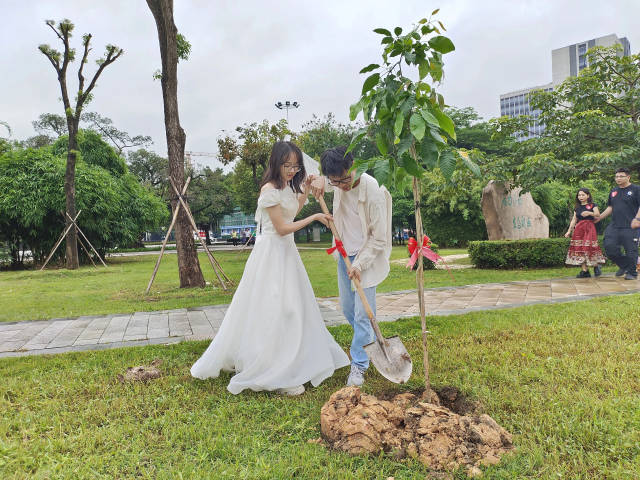 廣東深化婚俗改革,倡導(dǎo)婚事新辦,號召“有喜事來種樹”,圖為新人共種“愛情樹”。