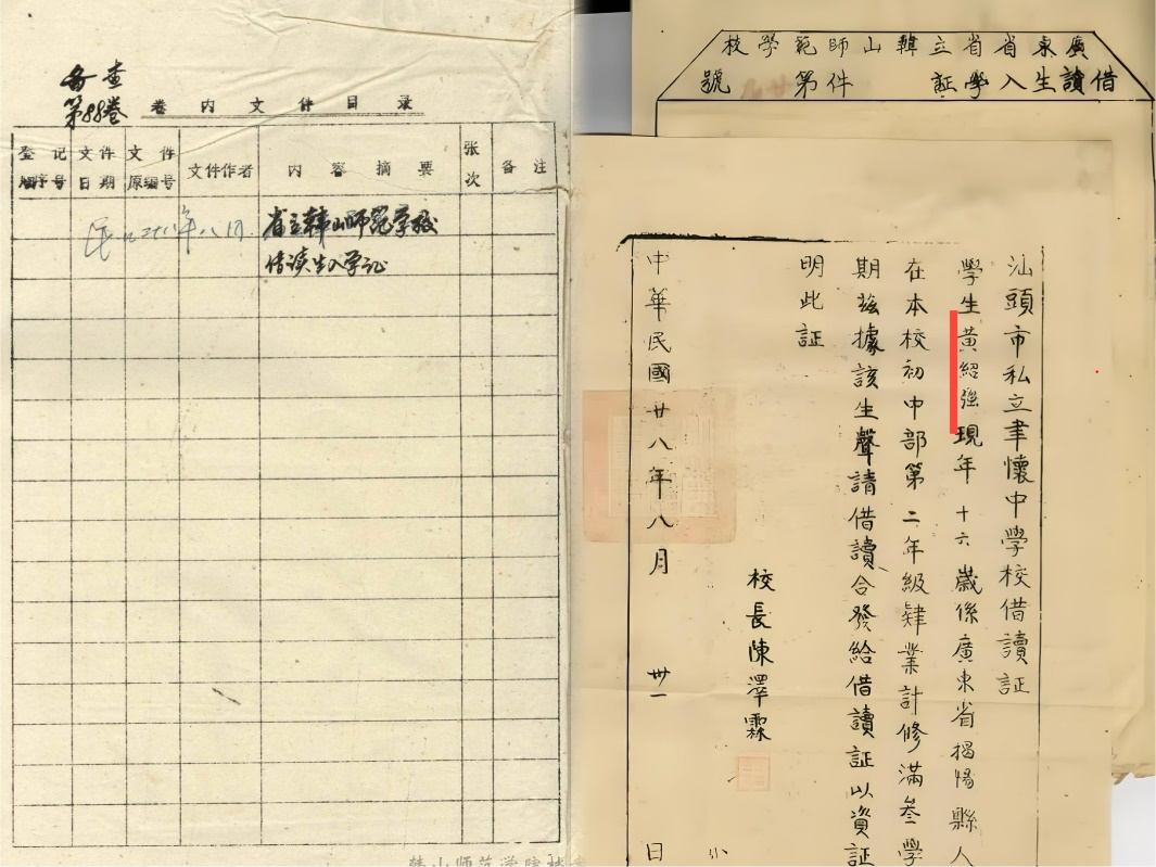 黃紹強的第廿九號借讀證。圖自韓師檔案