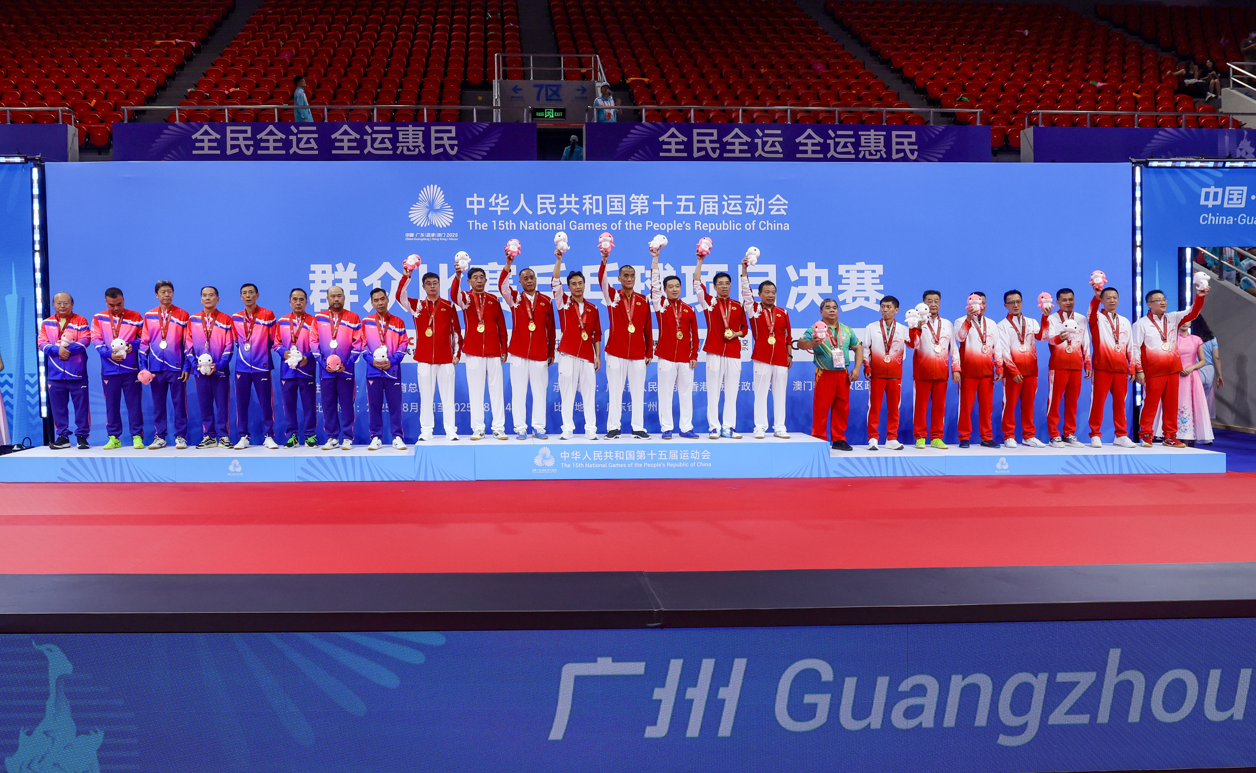 第十五屆全國運動會群眾比賽乒乓球項目決賽于8月11日晚上在廣州天河體育中心體育館決出男子團體與女子團體冠軍。在男團決賽上,河南隊以3比2險勝上海隊,首奪金牌。在女團決賽上,北京隊以3比1力克重慶隊,同樣首次登上最高領(lǐng)獎臺。
