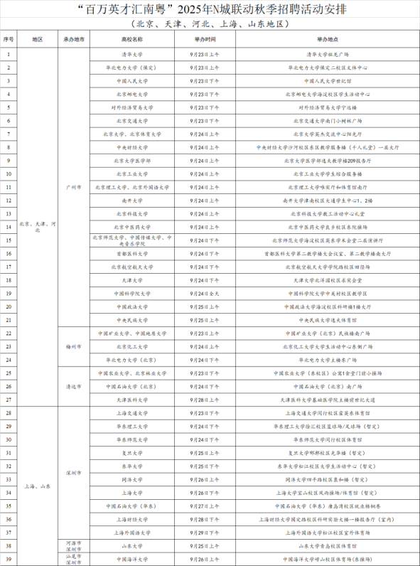 根據(jù)“百萬(wàn)英才匯南粵”行動(dòng)部署,2025年N城聯(lián)動(dòng)秋季招聘活動(dòng)將于9月下旬啟動(dòng);顒(dòng)圍繞“粵聚英才、粵見(jiàn)未來(lái)”主題,由廣東省委、省政府聯(lián)合教育部主辦,廣東省委人才辦、省人力資源社會(huì)保障廳、省教育廳以及廣東省21個(gè)地級(jí)以上市黨委、政府,廣東省委橫琴工委、廣東省政府橫琴辦承辦,以“萬(wàn)企進(jìn)百!备咝(chǎng)形式,線上線下組織逾1萬(wàn)家用人單位,到全國(guó)超100所重點(diǎn)高校,主動(dòng)上門邀約優(yōu)秀高校畢業(yè)生來(lái)粵就業(yè)創(chuàng)業(yè)。
