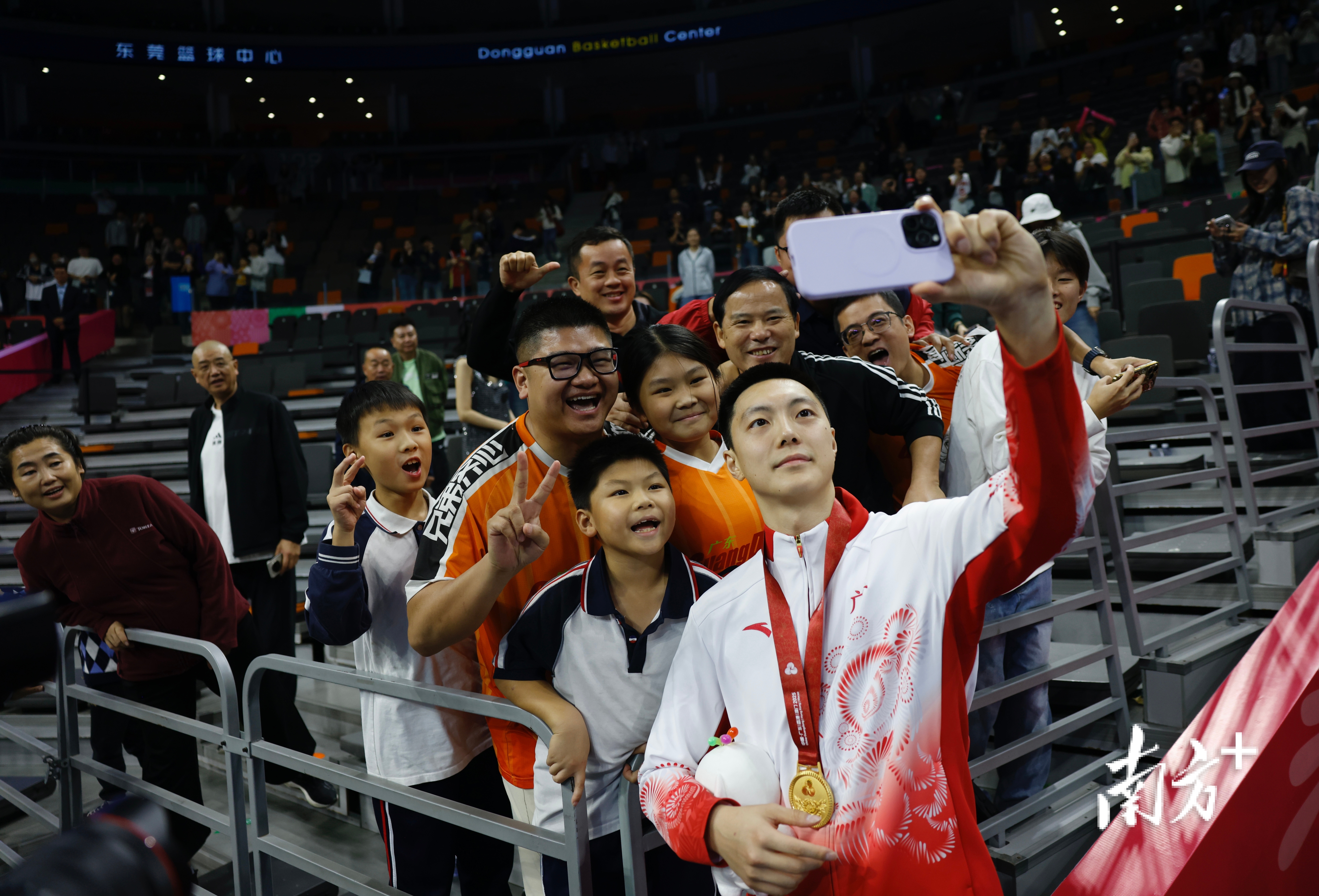 11月12日,十五運(yùn)會(huì)男籃成年組決賽,廣東隊(duì)獲得冠軍后,胡明軒與球迷們合影留念。張由瓊 攝