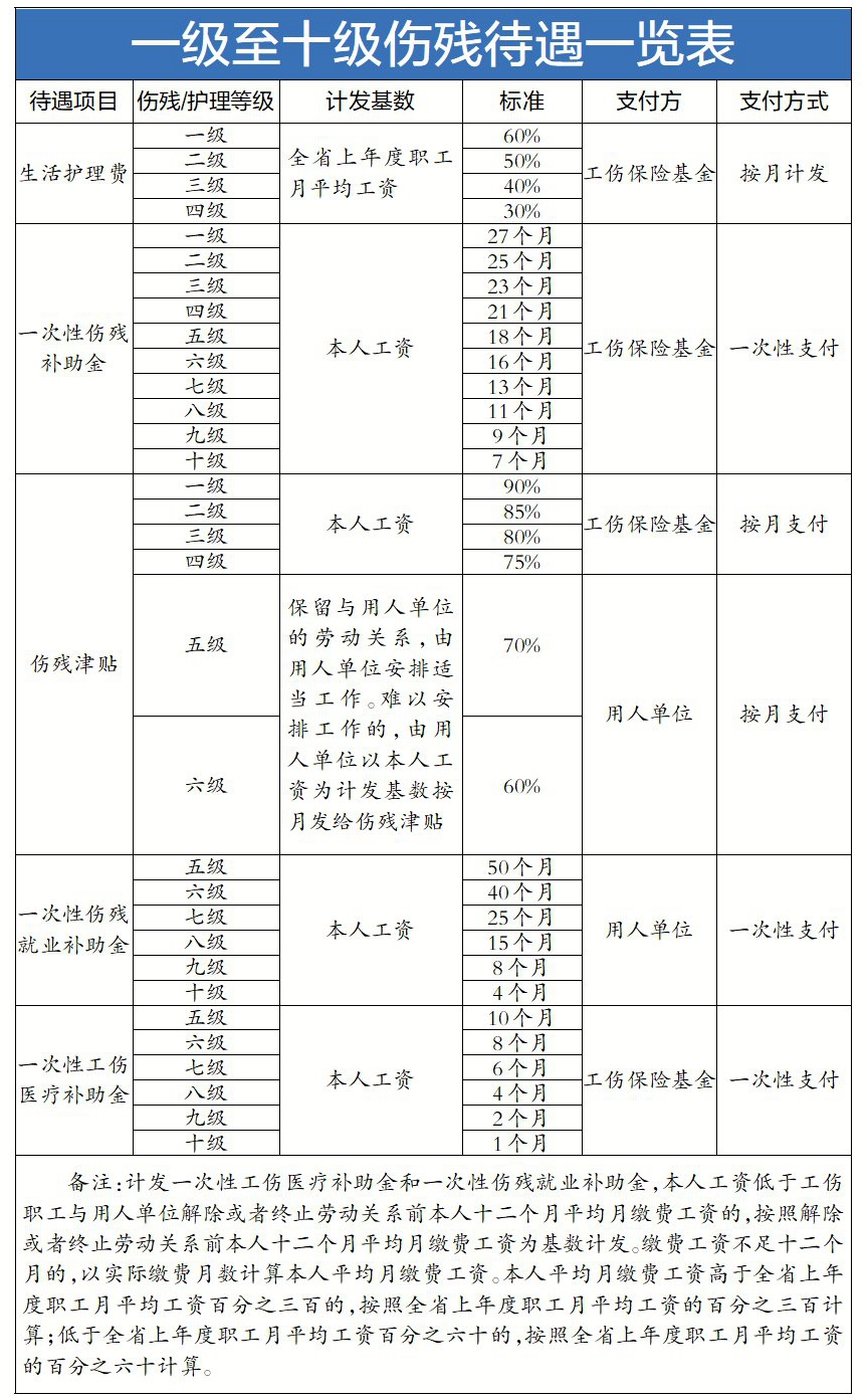 工傷傷殘職工除可享受工傷醫(yī)療費(fèi)、住院伙食補(bǔ)助費(fèi)報(bào)銷等工傷醫(yī)療待遇外,還可以按規(guī)定享受傷殘津貼、生活護(hù)理費(fèi)、一次性傷殘補(bǔ)助金、一次性工傷醫(yī)療補(bǔ)助金、一次性傷殘就業(yè)補(bǔ)助金等傷殘待遇(具體見(jiàn)《一級(jí)至十級(jí)傷殘待遇一覽表》)。