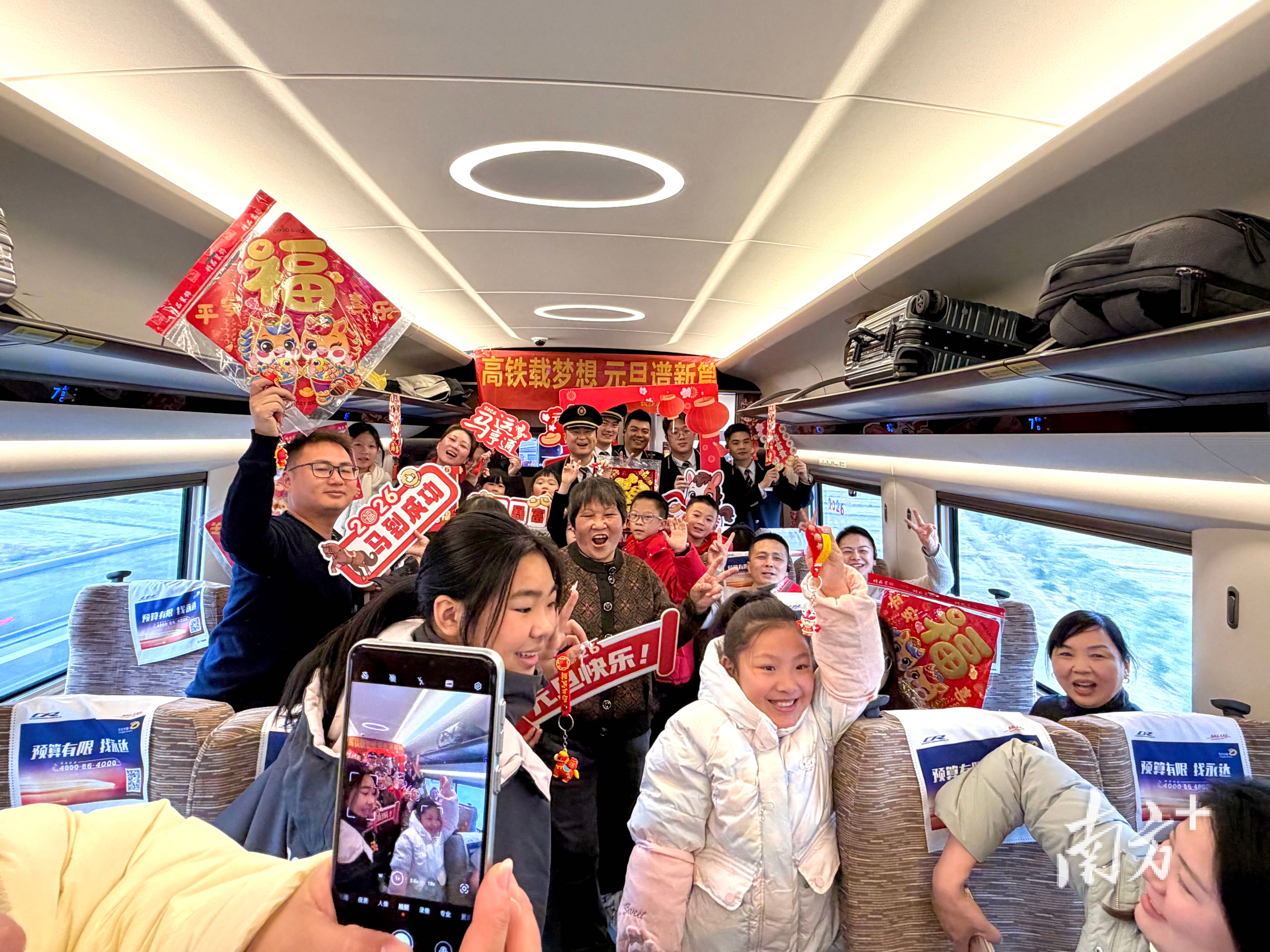 廣湛高鐵列車上,也洋溢著濃濃的節(jié)日氣息。G5237次復興號列車上還舉辦了跨年有獎問答活動熱!皬V湛高鐵全線最長的隧道叫什么名字?”列車長李玉潔的提問剛落,湛江籍大學生小張反應最快搶先回答出“公嶺隧道”,身旁的乘務員立刻送上了刻有湛江海灣大橋線條的黃銅書簽!皶炆系暮炒髽蛱屑亦l(xiāng)味了,元旦回家儀式感直接拉滿!”小張高興地說。