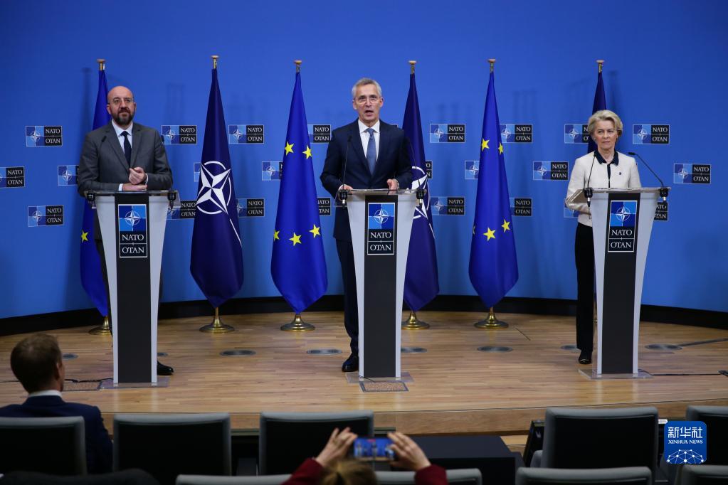 當(dāng)天上午,北約秘書長(zhǎng)斯托爾滕貝格、歐洲理事會(huì)主席米歇爾和歐盟委員會(huì)主席馮德萊恩在北約總部共同出席了宣言簽字儀式。