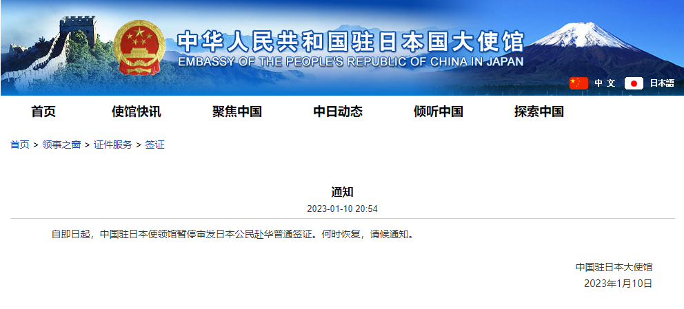 自即日起,中國駐日本使領館暫停審發(fā)日本公民赴華普通簽證。何時恢復,請候通知。