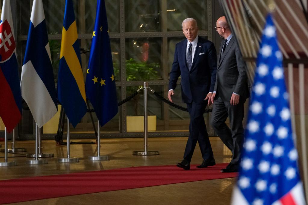2022年3月24日,美國總統(tǒng)拜登(左)和歐洲理事會(huì)主席米歇爾抵達(dá)歐盟總部。(新華社記者張鋮攝)
