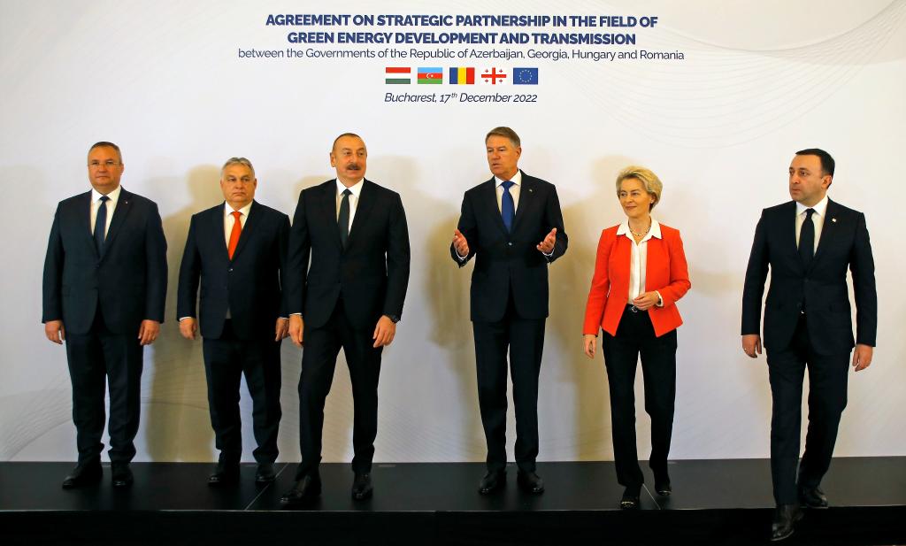 2022年12月17日,在羅馬尼亞首都布加勒斯特,羅馬尼亞總理丘克、匈牙利總理歐爾班、阿塞拜疆總統(tǒng)阿利耶夫、羅馬尼亞總統(tǒng)約翰尼斯、歐盟委員會(huì)主席馮德萊恩和格魯吉亞總理加里巴什維利(從左至右)在阿格羅匈四國綠色能源開發(fā)與運(yùn)輸戰(zhàn)略伙伴協(xié)議簽字儀式上合影。據(jù)媒體報(bào)道,該協(xié)議將為鋪設(shè)黑海海底電纜項(xiàng)目提供資金和技術(shù)框架。(新華社發(fā),克里斯泰爾攝)