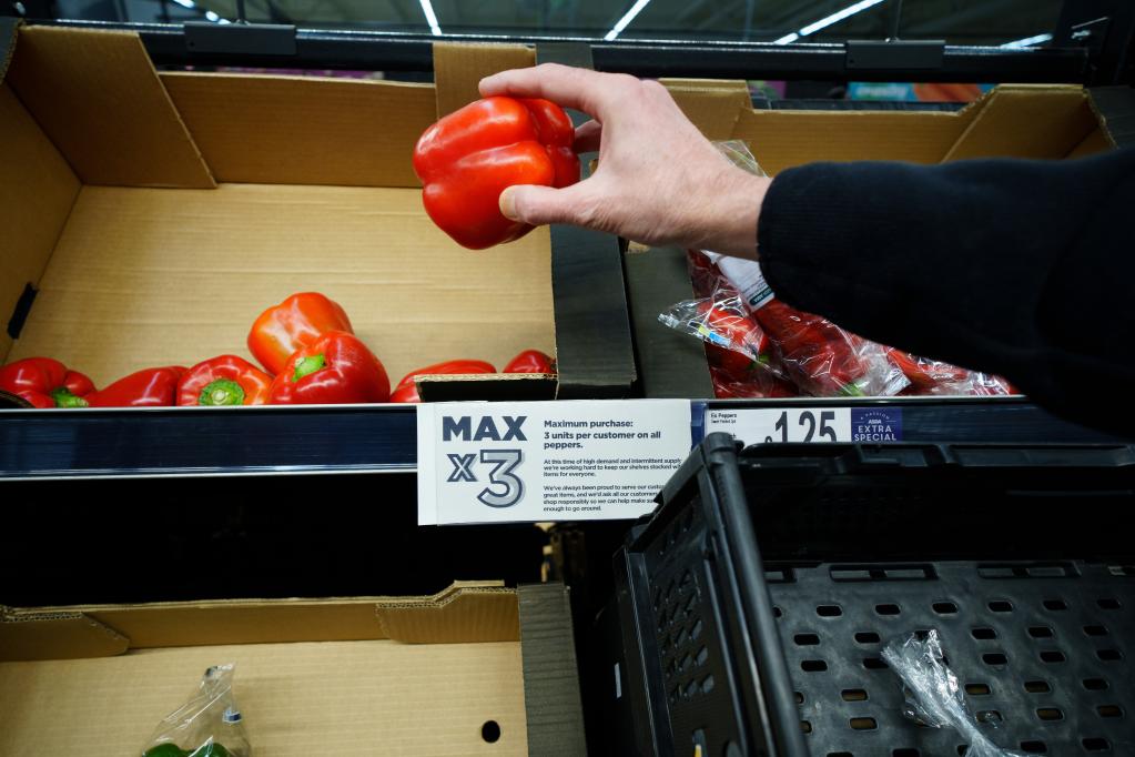 這是2月23日在英國曼徹斯特一家超市拍攝的蔬菜貨架上的限購?fù)ㄖ。按照通知,每名顧客一次只能最多購買3個彩椒。新華社發(fā)(喬恩·休珀攝)