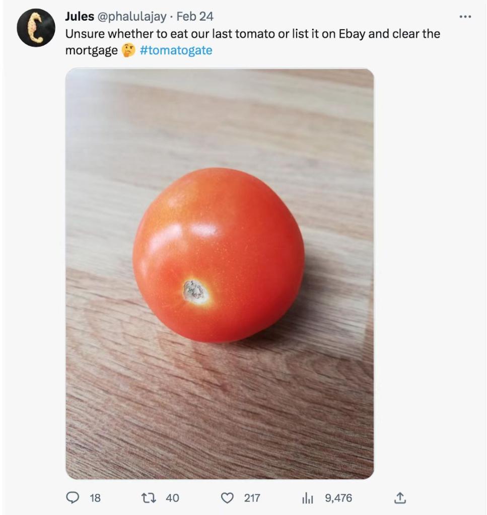 有英國網(wǎng)友在社交媒體上公布的賬單顯示,2月末他花費(fèi)了25英鎊(折合人民幣206.53元)購買了一袋共6個西紅柿。還有英國網(wǎng)友調(diào)侃說,看著家里最后一個西紅柿,難以決定是把它吃掉,還是把它賣掉還房貸。