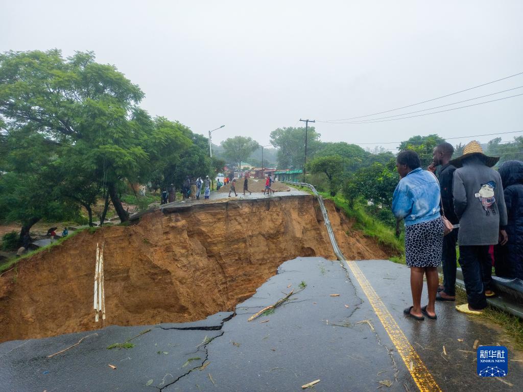 3月14日,在馬拉維南部的布蘭太爾地區(qū),人們查看被洪水沖毀的道路。新華社發(fā)(約瑟夫攝)