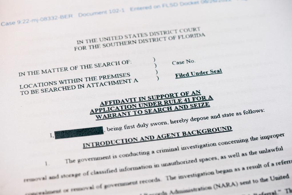 這是2022年8月26日拍攝的美國(guó)聯(lián)邦調(diào)查局申請(qǐng)搜查前總統(tǒng)特朗普住所海湖莊園時(shí)向法院提交書(shū)面證詞的部分內(nèi)容。新華社記者劉杰攝