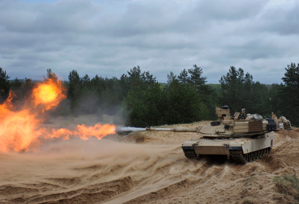 2015年5月7日,在拉脫維亞阿達(dá)日軍事基地靶場,一輛美軍“艾布拉姆斯”M1A2主戰(zhàn)坦克進(jìn)行實(shí)彈射擊訓(xùn)練。新華社記者郭群攝