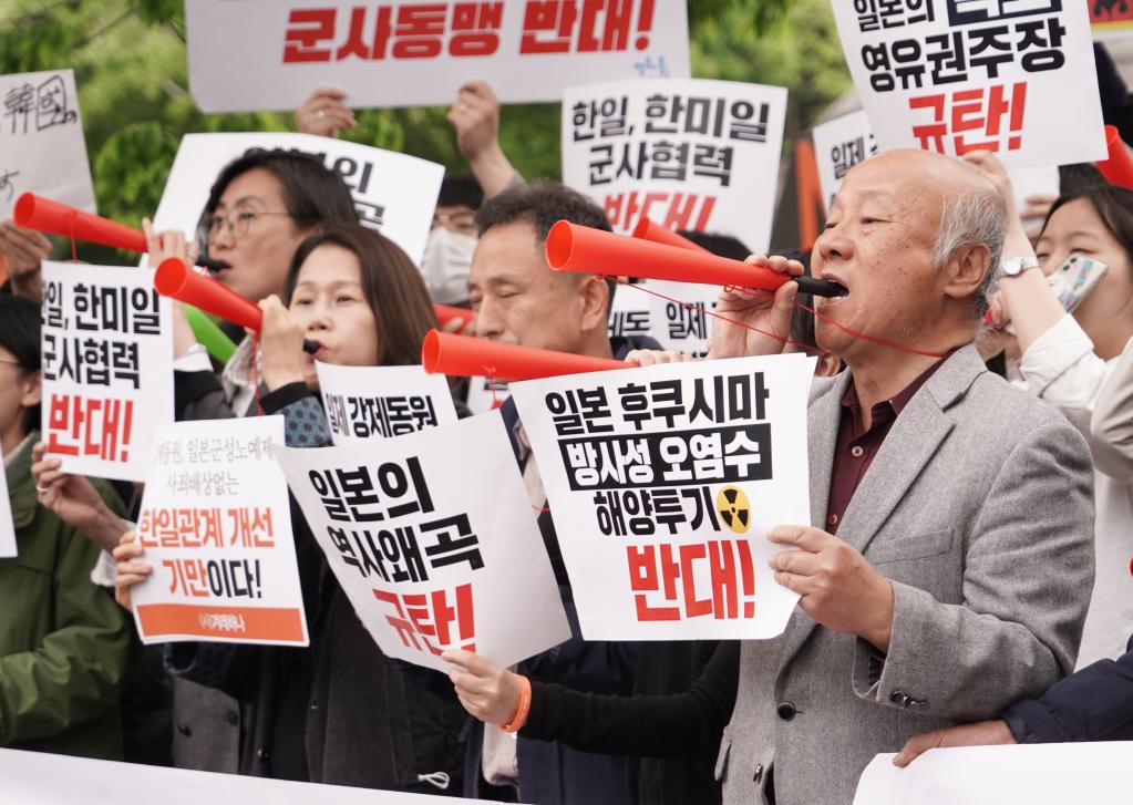 在韓國總統(tǒng)府前的集會現(xiàn)場,民眾手持“停止構(gòu)建韓美日同盟”“停止對日屈辱外交”“立即撤回核污染水排海計劃”等標語。他們要求日本政府對二戰(zhàn)期間的殖民統(tǒng)治進行道歉并給予賠償,強烈呼吁停止擴大韓美日三方軍事合作,共同維護地區(qū)和平穩(wěn)定。