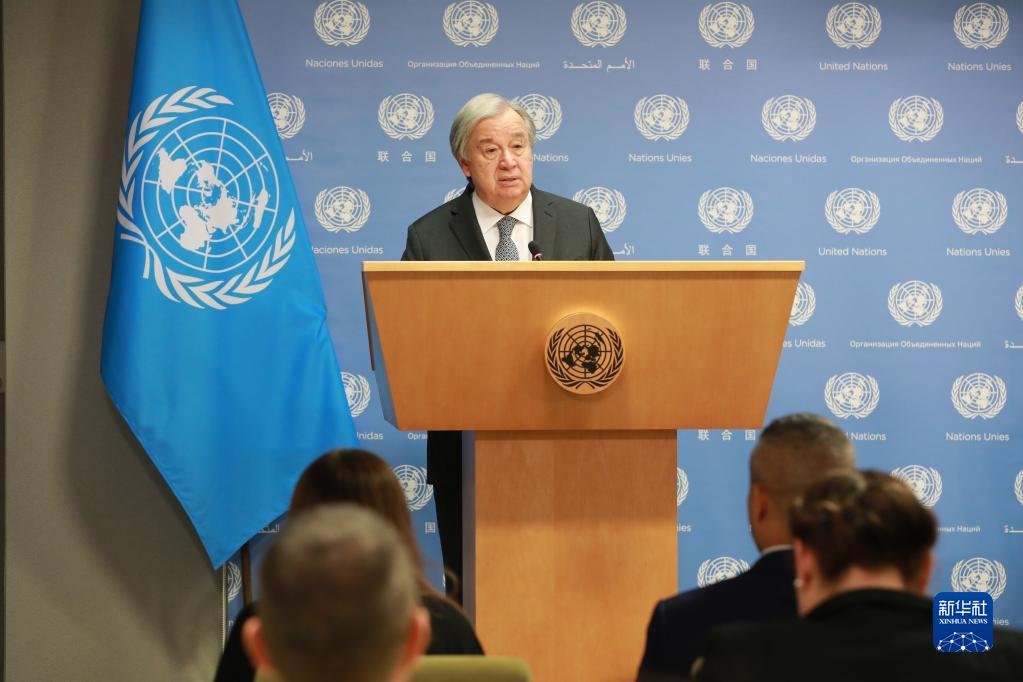 5月17日,在位于紐約的聯(lián)合國(guó)總部,聯(lián)合國(guó)秘書(shū)長(zhǎng)古特雷斯在記者會(huì)上講話。新華社記者謝鍔攝