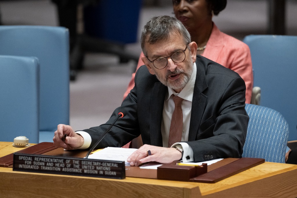 5月22日,在紐約聯(lián)合國(guó)總部,聯(lián)合國(guó)秘書長(zhǎng)蘇丹問(wèn)題特別代表福爾克·佩爾特斯在安理會(huì)審議蘇丹問(wèn)題時(shí)發(fā)言。新華社發(fā)(聯(lián)合國(guó)供圖/埃瑟金德爾·德貝卜攝)