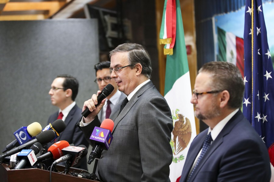 2019年8月5日,在美國得克薩斯州埃爾帕索的墨西哥駐埃爾帕索領(lǐng)事館,墨西哥外長埃布拉德(左三)在記者會(huì)上講話。新華社記者王迎攝