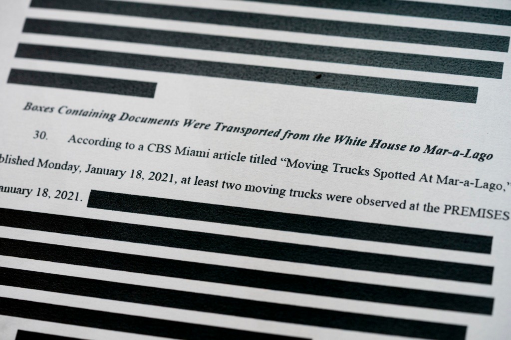 這是2022年8月26日拍攝的美國聯(lián)邦調(diào)查局申請搜查前總統(tǒng)特朗普住所海湖莊園時向法院提交書面證詞的部分內(nèi)容。新華社記者劉杰攝