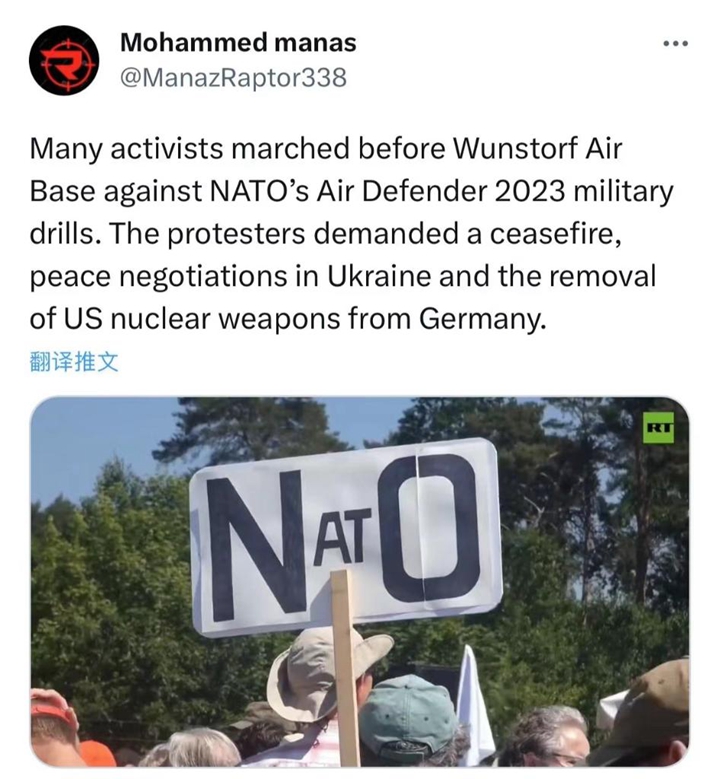 北約正在德國等地舉行成立以來規(guī)模最大的空中軍事演習(xí),為期長達(dá)11天,25個國家約1萬名軍人和250架各型軍機參加。接連三天,德國多地舉行抗議活動,批評以美國為首的北約通過輸出軍援、大規(guī)模軍演來持續(xù)“拱火”俄烏沖突。
