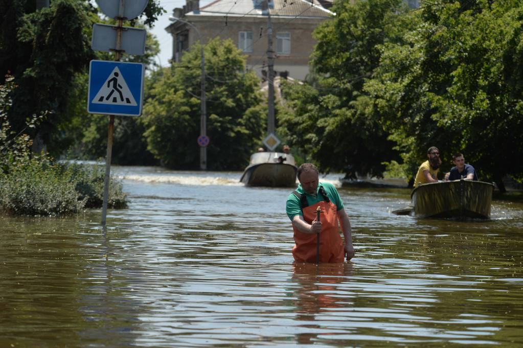 6月9日,一名水利工作人員在赫爾松市被洪水淹沒的街道測量水位。新華社發(fā)(彼得·德魯克攝)