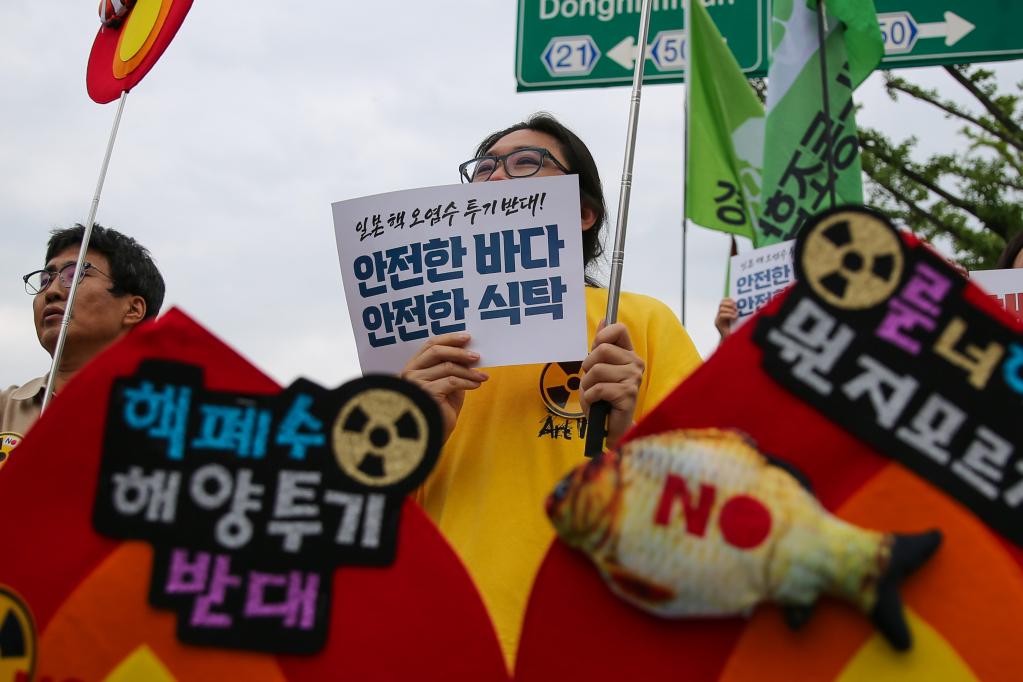7月8日,民眾在韓國(guó)首爾手舉標(biāo)語牌參加集會(huì),反對(duì)日本核污染水排海。(新華社記者王益亮攝)