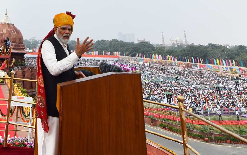 8月15日,印度總理莫迪在德里出席獨(dú)立日慶;顒(dòng)時(shí)發(fā)表講話。新華社發(fā)