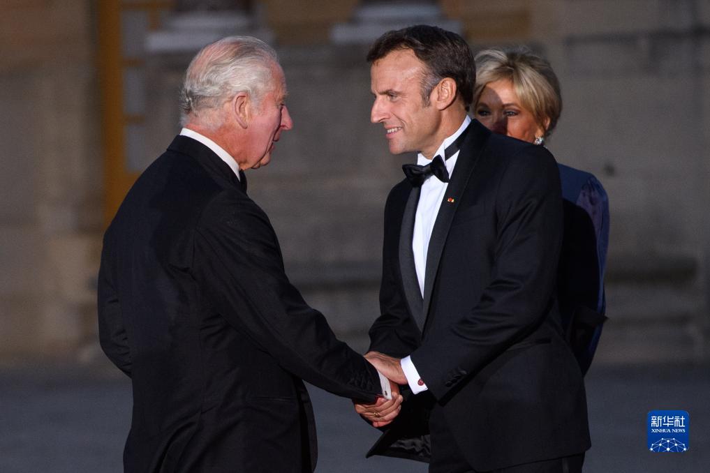 9月20日,在法國巴黎近郊的凡爾賽宮,法國總統(tǒng)馬克龍(中)迎接前來出席國宴的英國國王查爾斯三世(左一)。新華社發(fā)(朱利安·馬蒂亞攝)