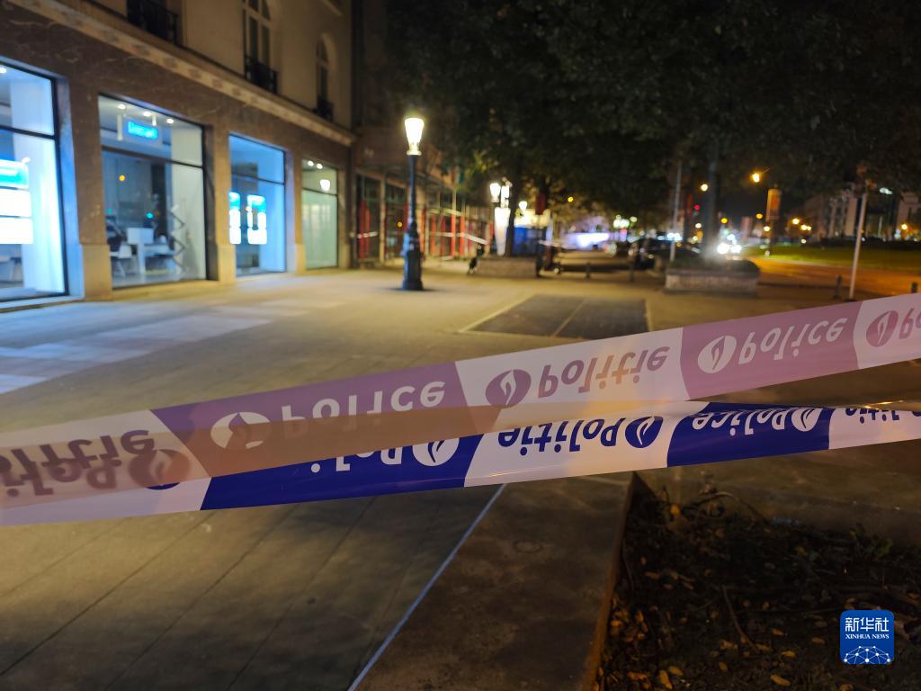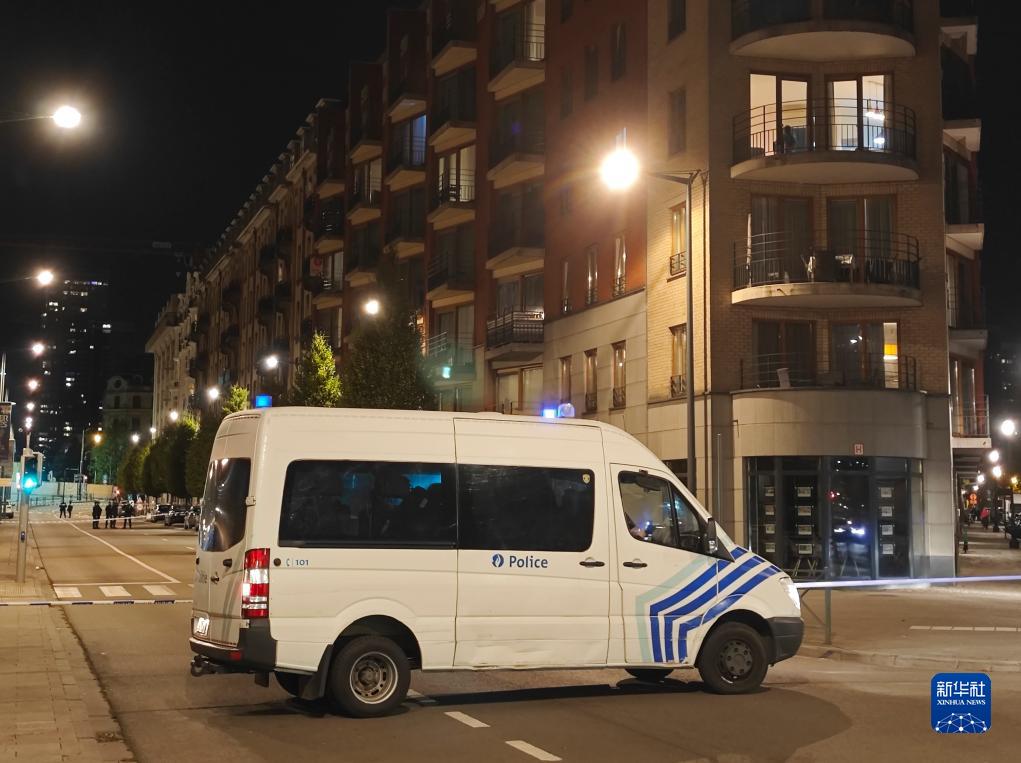 10月16日,在比利時布魯塞爾,警方在槍擊事件現(xiàn)場警戒。新華社記者 劉宇軒 攝