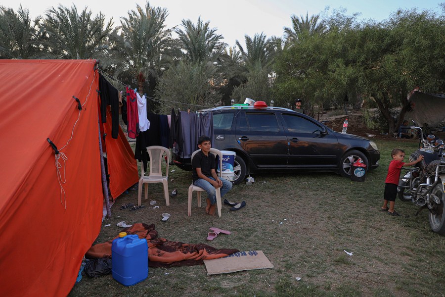 10月17日,在加沙地帶南部城市汗尤尼斯,人們?cè)卺t(yī)院避難所內(nèi)休息。新華社發(fā)(里澤克·阿卜杜勒賈瓦德攝)