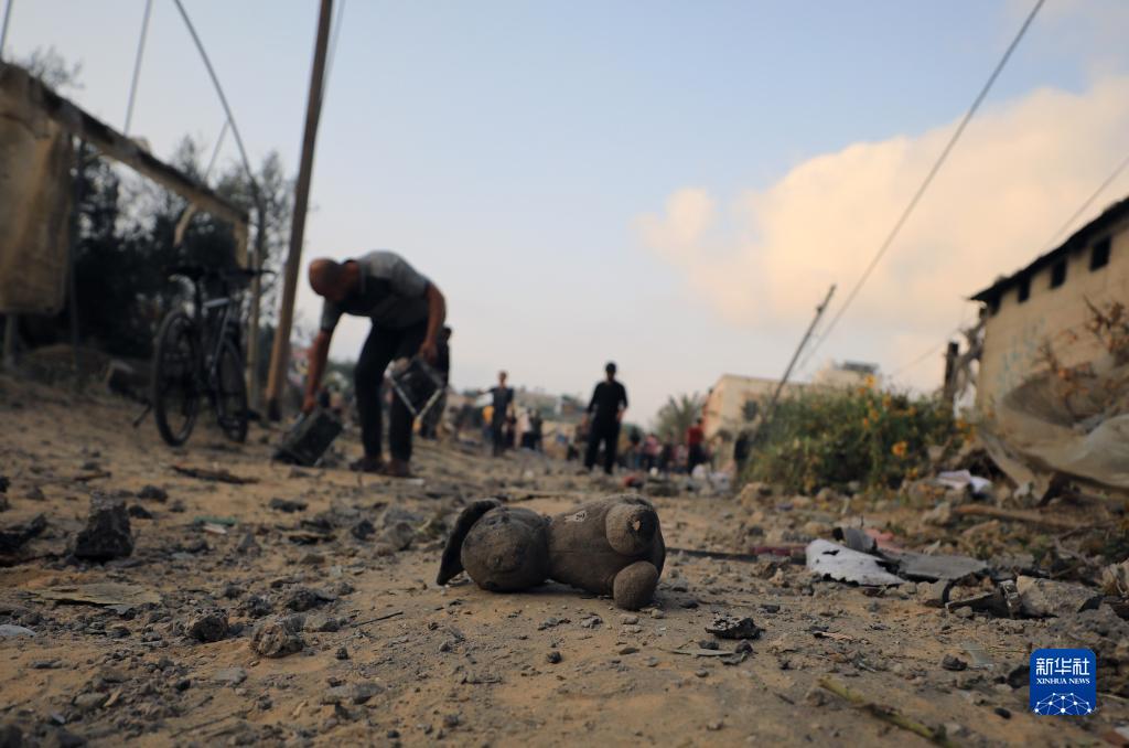 10月23日,人們在加沙地帶南部城市汗尤尼斯查看空襲后的建筑廢墟。新華社發(fā)(亞西爾·庫迪攝)