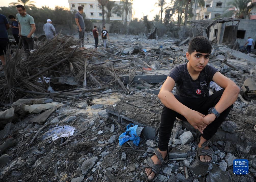 10月23日,在加沙地帶南部城市汗尤尼斯,一名男孩坐在遭以色列空襲后的建筑廢墟上。新華社發(fā)(亞西爾·庫迪攝)