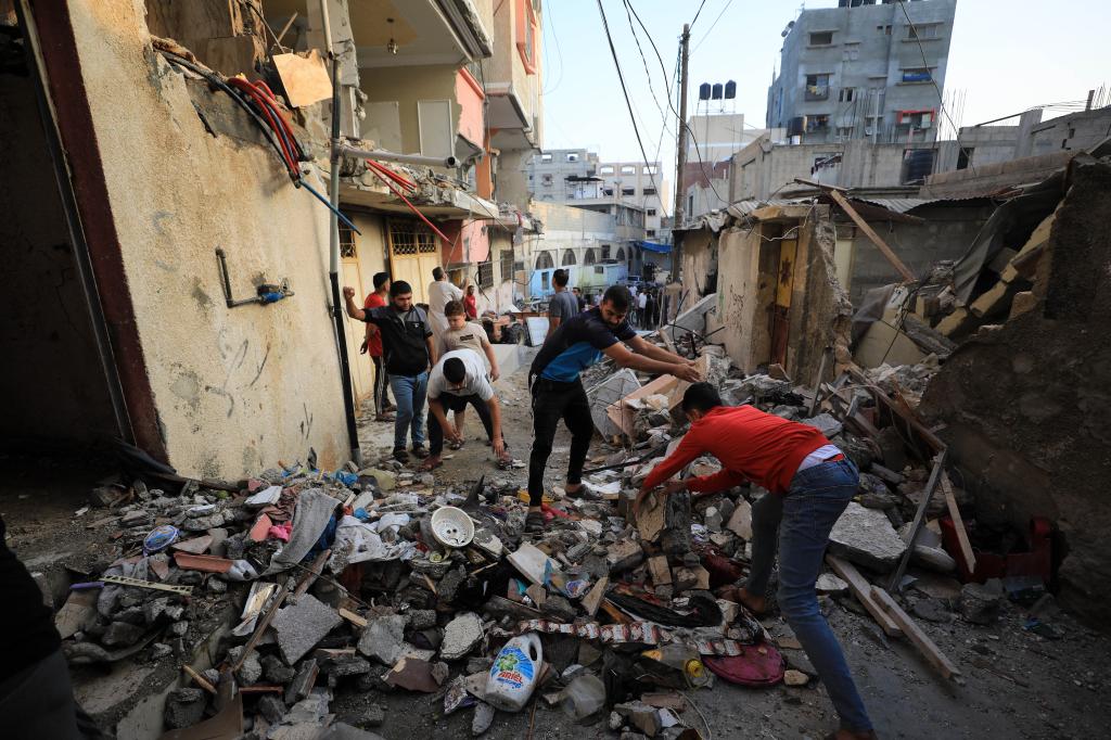 11月3日,在加沙地帶南部城市汗尤尼斯,人們清理遭以色列襲擊后的建筑廢墟。 新華社發(fā)(亞西爾·庫迪攝)