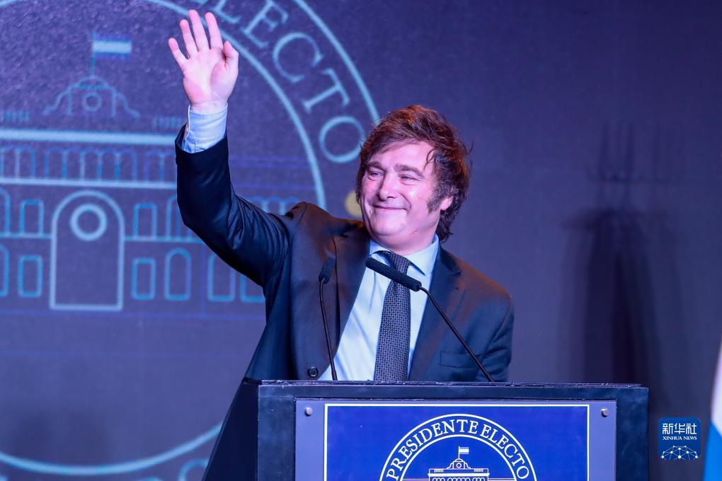 11月19日,阿根廷極右翼選舉聯(lián)盟“自由前進(jìn)黨”候選人米萊在首都布宜諾斯艾利斯的競(jìng)選總部外向民眾致意。新華社發(fā)(盧西亞諾·托雷斯攝)
