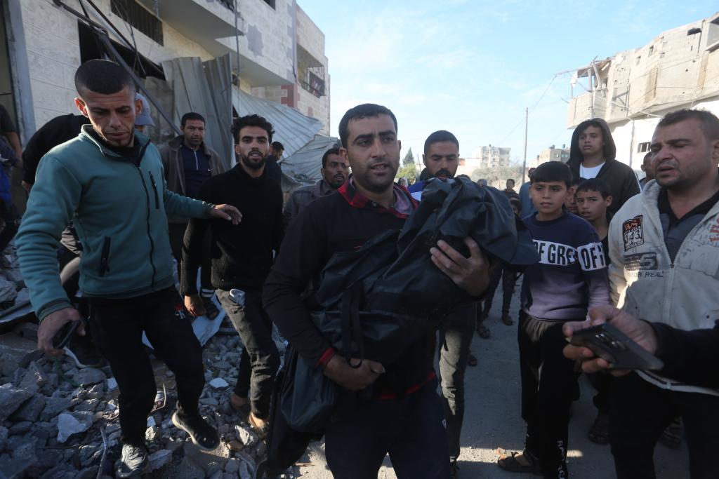 12月4日,在加沙地帶南部城市拉法,一名男子抱著以軍空襲遇難者的遺體。新華社發(fā)(哈立德·奧馬爾攝)