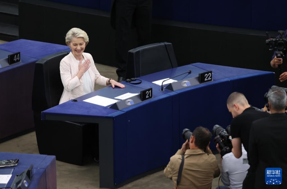 7月18日,在法國(guó)斯特拉斯堡歐洲議會(huì)總部,馮德萊恩在再次當(dāng)選歐盟委員會(huì)主席后慶祝。新華社記者 趙丁喆 攝