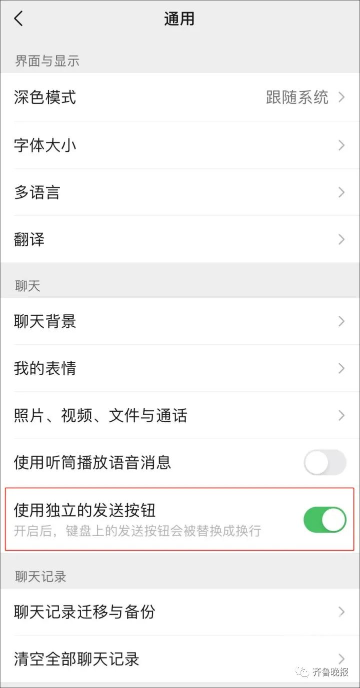 更新后在【微信】-【我】-【設(shè)置】-【通用】-【使用獨(dú)立的發(fā)送按鈕】,默認(rèn)關(guān)閉,手動(dòng)開(kāi)啟后,鍵盤上的發(fā)送按鈕就會(huì)替換成換行。